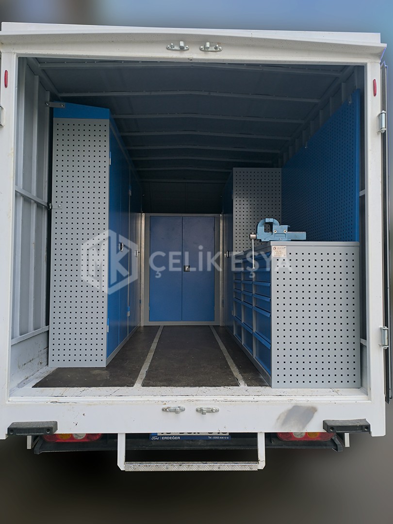 Ford Kamyonet MK-437 Araç içi raf ve dolap sistemlerimiz, birçok farklı sektörde faaliyet gösteren firmaların ihtiyaçlarını göz önünde bulundurarak tasarlanıp üretilmektedir. Özellikle yerinde servis hizmeti veren firmaların bakım aracı ihtiyaçlarını karşılamaktadır. Bu tarz servis ve bakım araçlarının ihtiyaç duyduğu alet ve edevatların derli toplu muhafazası sağlanır. Ayrıca araç içinin fonksiyonel kullanımının yanında görsel olarak da zenginleştirir.