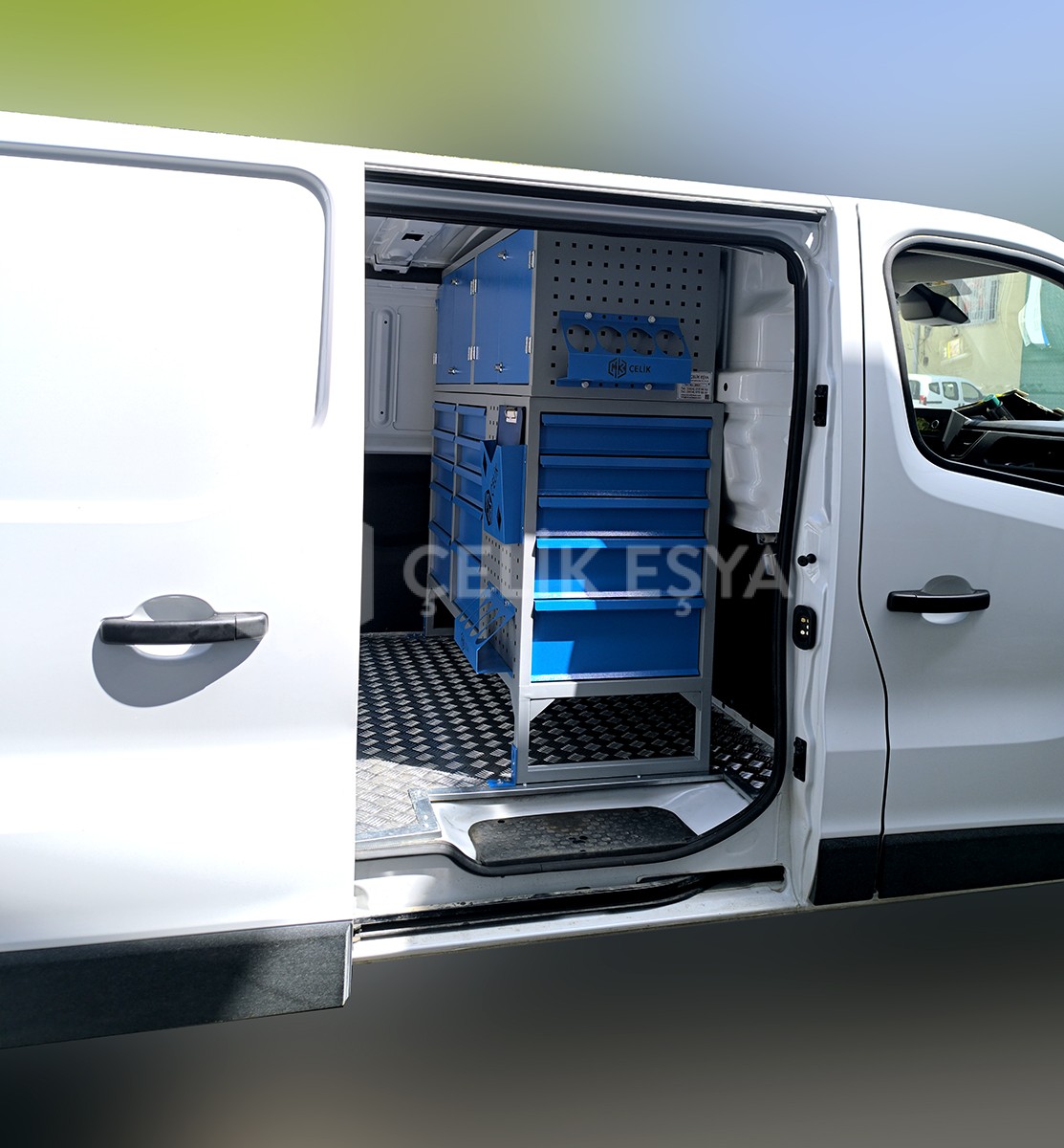 Renault Trafik MK-441 Araç içi raf ve dolap sistemlerimiz, birçok farklı sektörde faaliyet gösteren firmaların ihtiyaçlarını göz önünde bulundurarak tasarlanıp üretilmektedir. Özellikle yerinde servis hizmeti veren firmaların bakım aracı ihtiyaçlarını karşılamaktadır. Bu tarz servis ve bakım araçlarının ihtiyaç duyduğu alet ve edevatların derli toplu muhafazası sağlanır. Ayrıca araç içinin fonksiyonel kullanımının yanında görsel olarak da zenginleştirir.